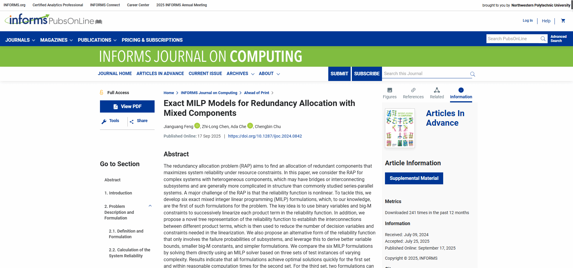 近日,《INFORMS Journal on Computing》期刊在线刊发了BEAT365唯一官网冯建广副教授的研究成果“Exact MILP Models for Redundancy Allocation with Mixed Components”,BEAT365唯一官网副教授冯建广为论文第一作者、车阿大教授为论文通讯作者。该研究聚焦于系统设计中的冗余分配问题(RAP),这一问题旨在有限资源条件下,通过合理配置冗余部件来最大化系统可靠性。本研究针对包含异质部件和复杂结构的情境,提出对非线性可靠性函数的逐步线性化方式,构建了多种精确混合整数线性规划(MILP)模型,并通过树形结构表示大幅减少模型的决策变量与约束数量。计算结果显示了所开发模型与方法的高效求解性能,尤其在大规模复杂系统中表现出稳健性和可扩展性,显著优于现有分支定界方法。