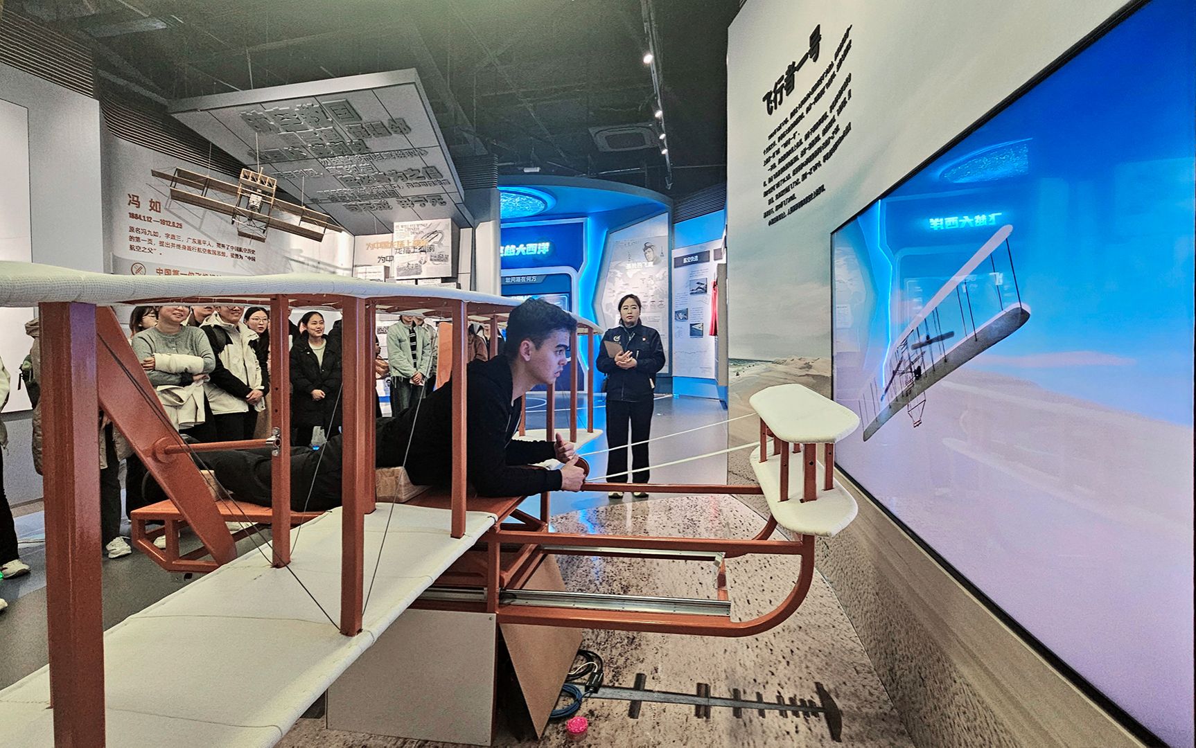 在智慧飞行馆中,学子们借助动画演示与仿真模拟设备,系统追溯飞控、导航技术的演进历程并展望前沿方向。在莱特飞机复刻模型前,众人亲自动手操控驾驶装置,直观感悟飞行控制的核心原理。进入C919模拟驾驶舱,面对数字化仪表盘与三维动态仪表系统展开专业实训,通过精准调控空速、航向、升降率参数,在讲解员全程指导下完成起飞、巡航、紧急返航等全流程模拟操作。