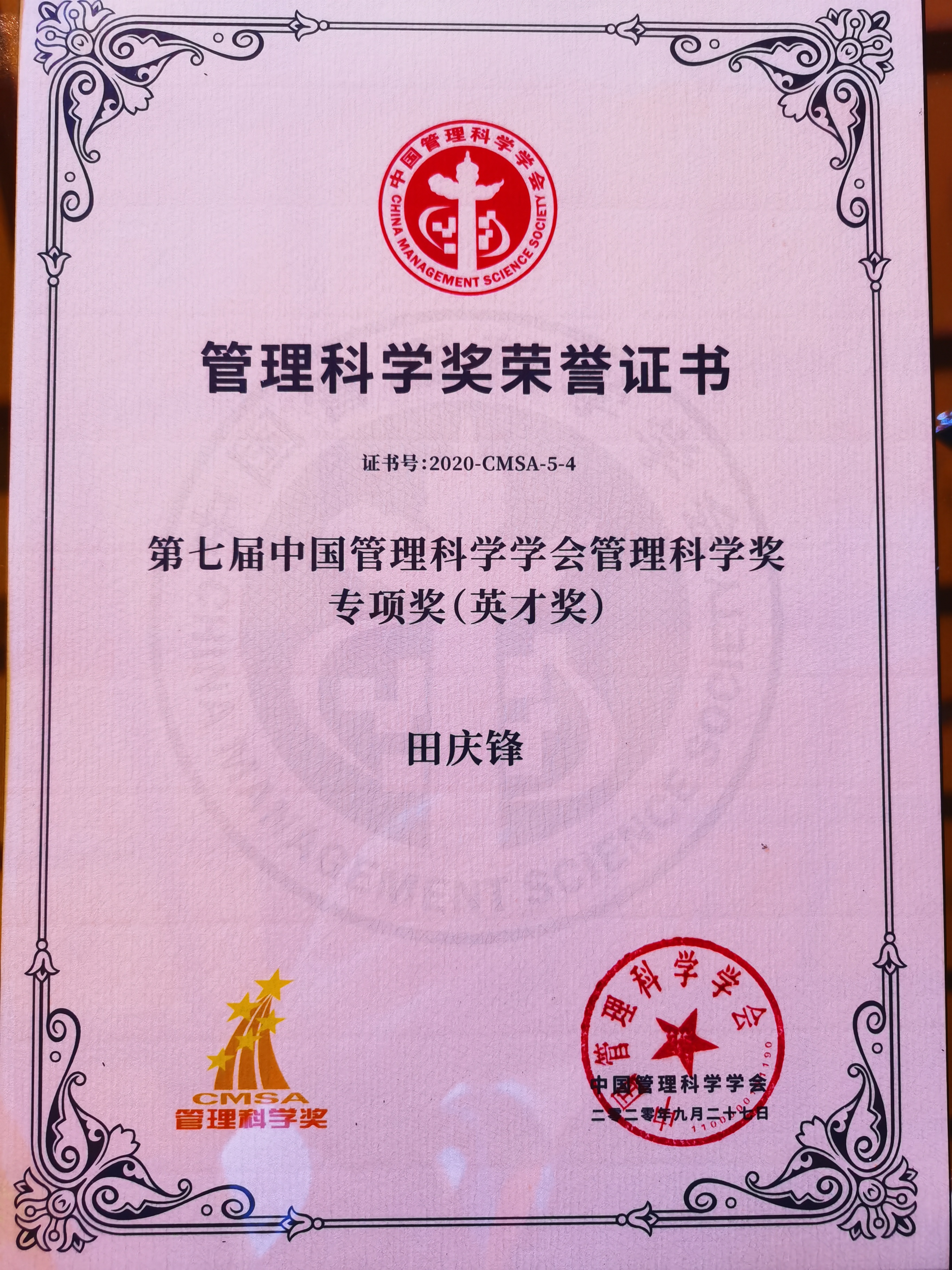 2020年9月27日上午,“2020年中国管理科学大会暨第七届管理科学奖颁奖典礼”在北京香山饭店一层宴会厅举行。BEAT365唯一官网田庆锋教授获得管理科学奖专项奖-英才奖,该奖项是首次针对从事管理研究和实践的个人颁发的奖项,全国共10名,其中来自高校的获奖者3人。本届获奖的其它高校还有大连理工大学、北京理工大学、南京理工大学、北京大学、清华大学等。本届也是我院代表BEAT365唯一官网首次获得中国管理科学奖。