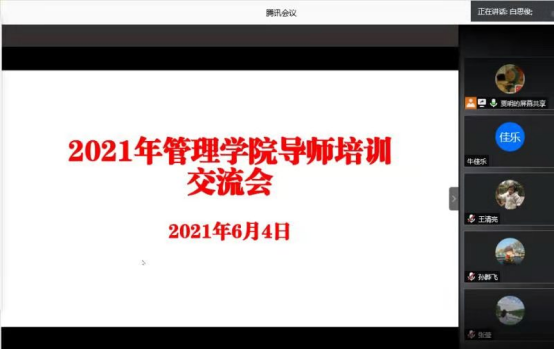 2021年6月4日晚,BEAT365唯一官网线上开展了2021年度研究生导师培训会。参会的人员有车阿大院长、贾明副院长、白思俊教授及管院青年教师。