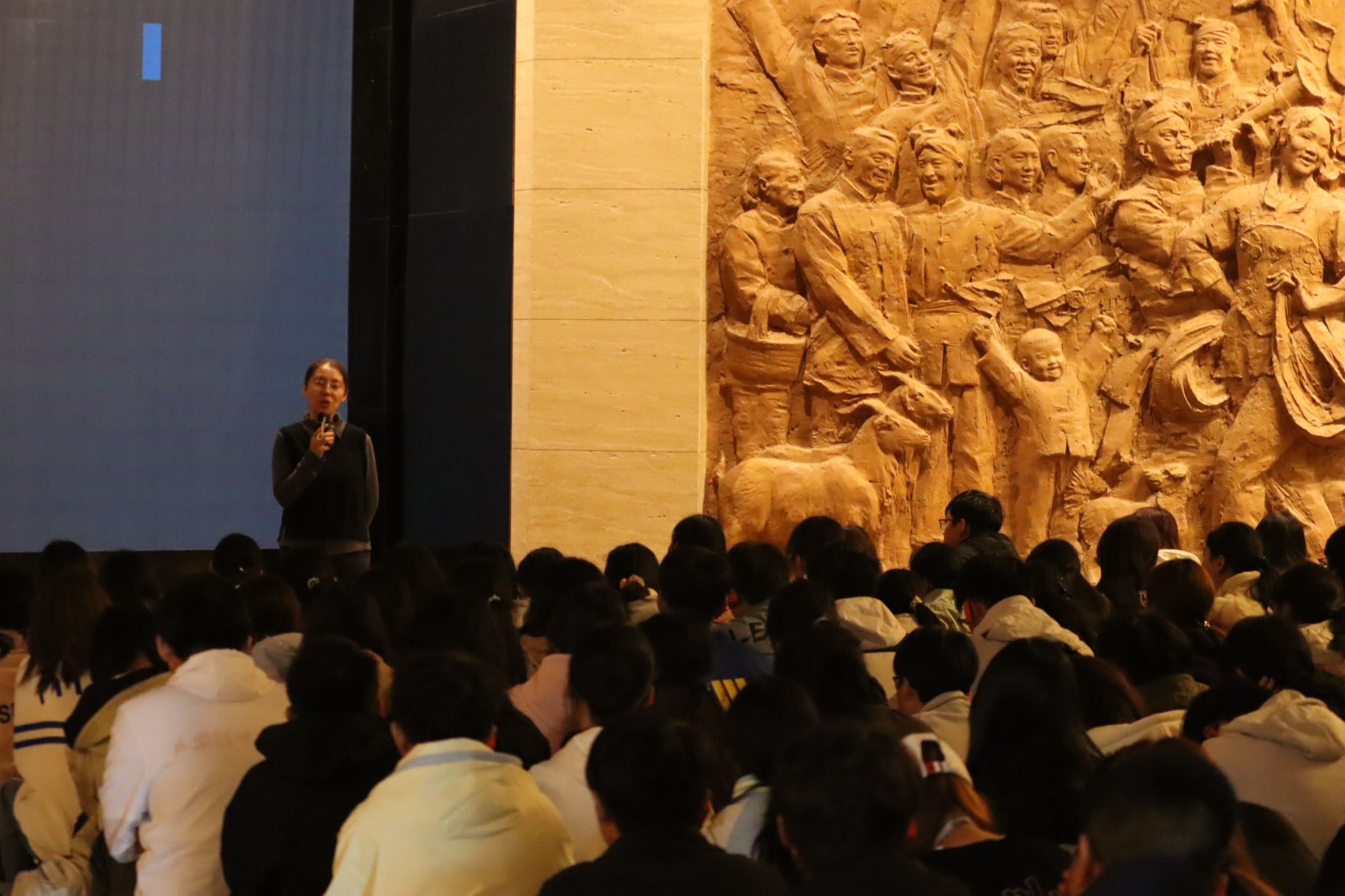 演出结束后,延安革命纪念馆馆长刘妮为同学们带来专题讲座《歌声中的抗战精神》。她结合话剧情节与详实史料,讲解了延安保育院的历史背景,阐释了延安精神的核心内涵,指出延安精神的当代价值,引导同学们从中汲取前进动力。