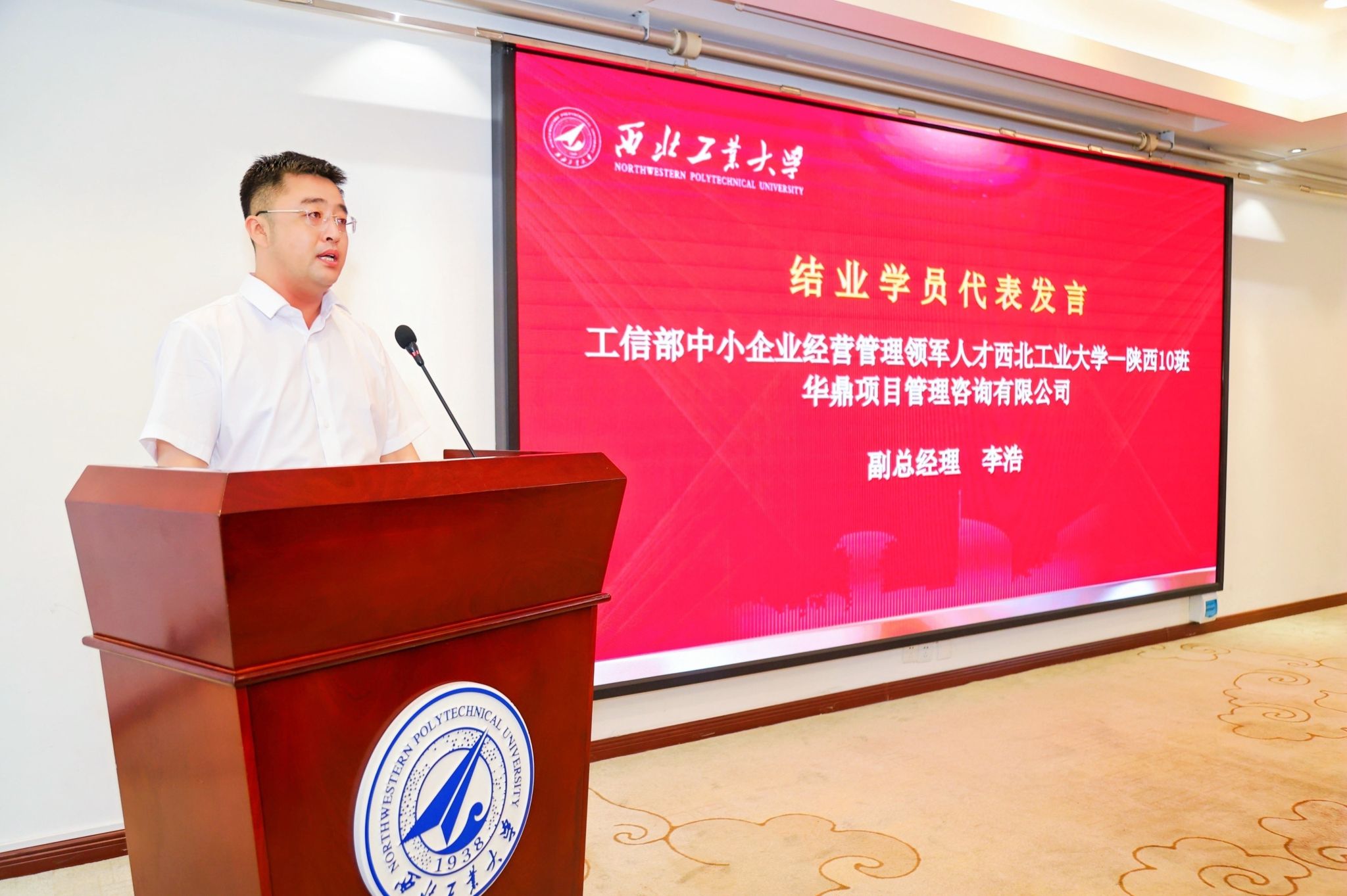 往期学员代表、领军人才西工大—陕西9班班长、西安华煜鼎尊新材料科技有限公司董事长李佳,结业学员代表、领军人才西工大—陕西10班班长、华鼎项目管理咨询有限公司副总经理李浩,专精特新培育班班长、西安泰金新能股份有限公司董事长冯庆先后发言。回首这段学习历程,大家收获的不仅仅是知识,更是一种视野的拓展、思维的提升和格局的放大。如何在变局之中开新局、在危机之中寻新机,是每个企业家都要面对的问题。结业不是结束,在未来的企业管理中学以致用,聚焦国家战略和市场需求,加强创新引领,加快形成新质生产力,形成产业链融合,以昂扬的精神状态、只争朝夕、埋头苦干,勇毅前行。