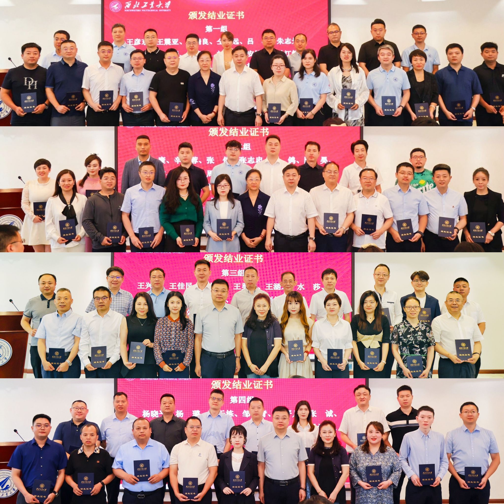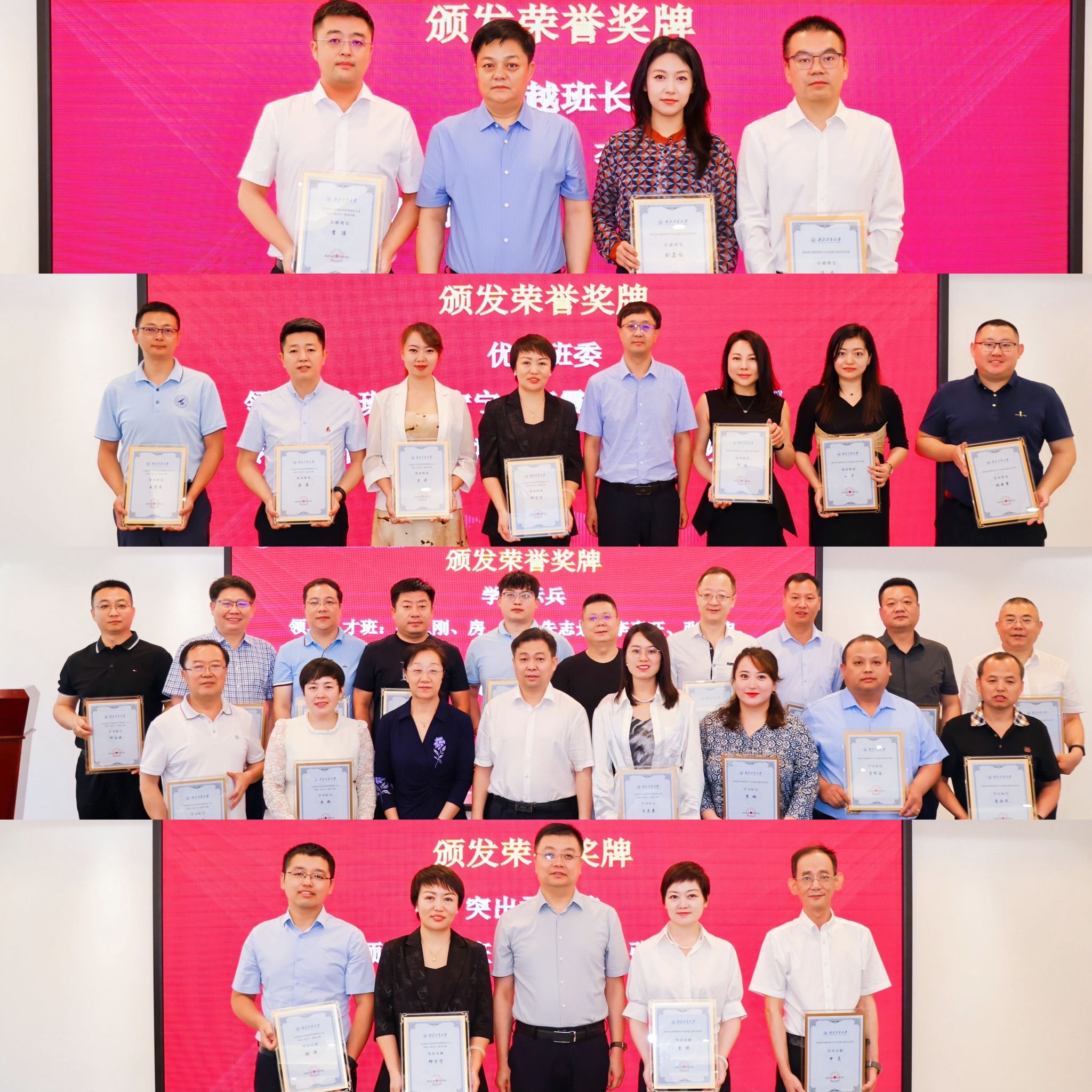 在两个班结业回顾短片后,省工信厅产业链推进处兼运行监测处张勇处长、中小企业服务处豆宁处长,非公经济发展处黄克强二级调研员,中小企业人才服务中心李卫科副主任,西工大BEAT365唯一官网张爽书记,对外联络办公室徐伟侠副主任为结业学员颁发结业证书和荣誉奖牌。希望结业学员们发挥传帮带作用,继续为西工大企业家培育平台建设添砖加瓦。
