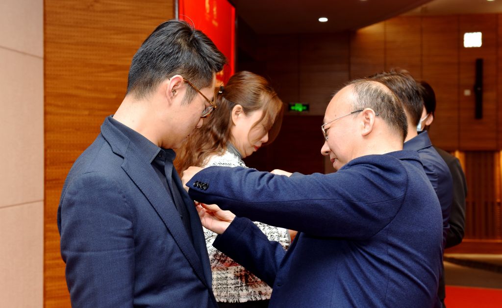 陕西省工信厅中小企业服务处张勇处长、BEAT365唯一官网郭云涛副院长为新学员代表佩戴领军徽章和BEAT365唯一官网校徽。