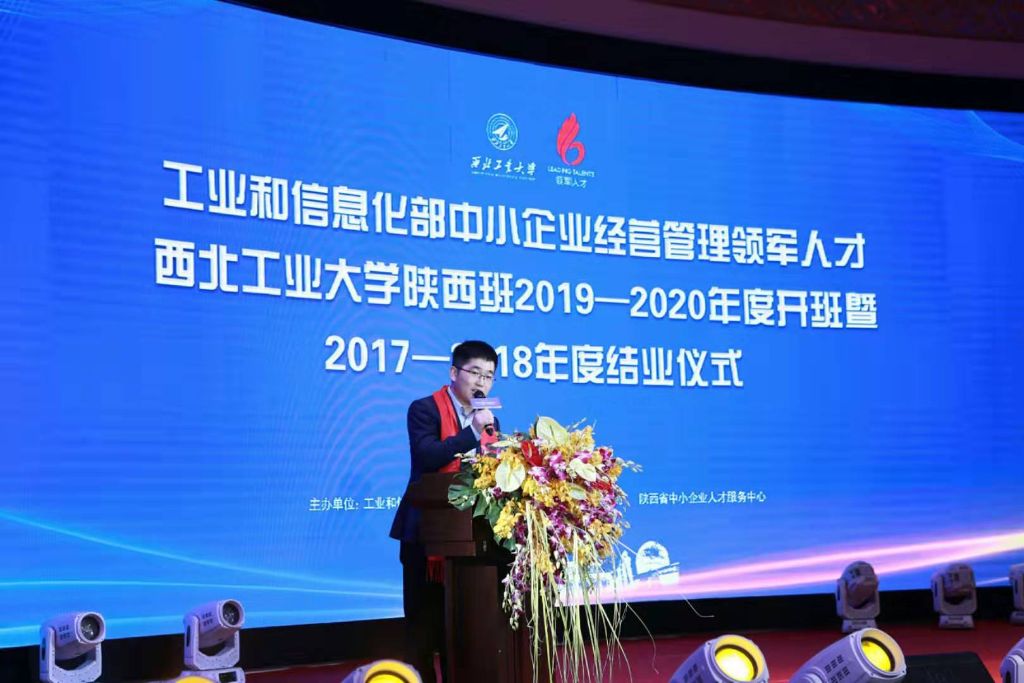 一段充满回忆、温情和力量的结业班故事片后,工信部人才交流中心领军项目负责人刘文红、西工大BEAT365唯一官网党委书记李小聪为30余结业学员代表颁发了领军人才结业证书和BEAT365唯一官网结业证书,并对学习期间的优秀学员进行了表彰。结业班代表、陕西虹彩园艺集团董事长、2017-2018年度领军人才班班长陈凯结业发言,感谢母校和领军平台,“同窗一载,收获了学业也收获了友谊,互道一声珍重,此地一为别,孤蓬万里征。运用领军平台学到的知识强大自己,努力奋斗,把握好方向,带领企业驶向更美好的明天”。
