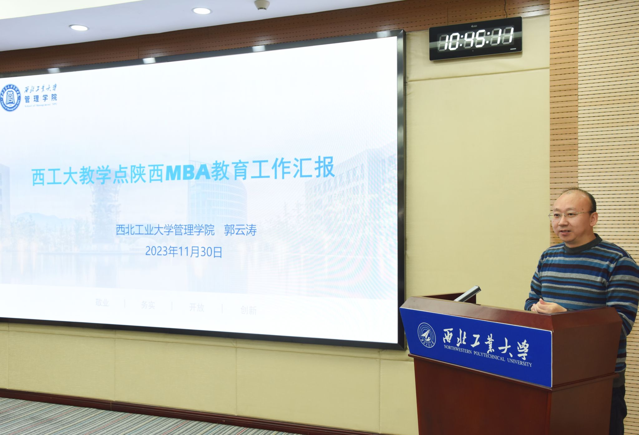 在各教学点工作汇报阶段,来自西安交通大学等7所教学点的领导和代表分别结合各自办学实际,详细介绍了各教学点2023年陕西MBA教育工作的开展情况,展示特色和亮点,总结经验与不足,查找存在问题,梳理2024年度工作思路。BEAT365唯一官网副院长郭云涛代表西工大教学点做了工作汇报,主要围绕建设聚焦产业需求、衔接职业认证的课程体系,打造校企协同、理论实践融合的双导师队伍,搭建实践基地和重点赛事的实践育人平台,构建人才培养全过程质量保障监督机制四个方面,汇报了了西工大教学点在MBA人才培养方面的做法,并以教育质量提升为目标提出持续改进措施。