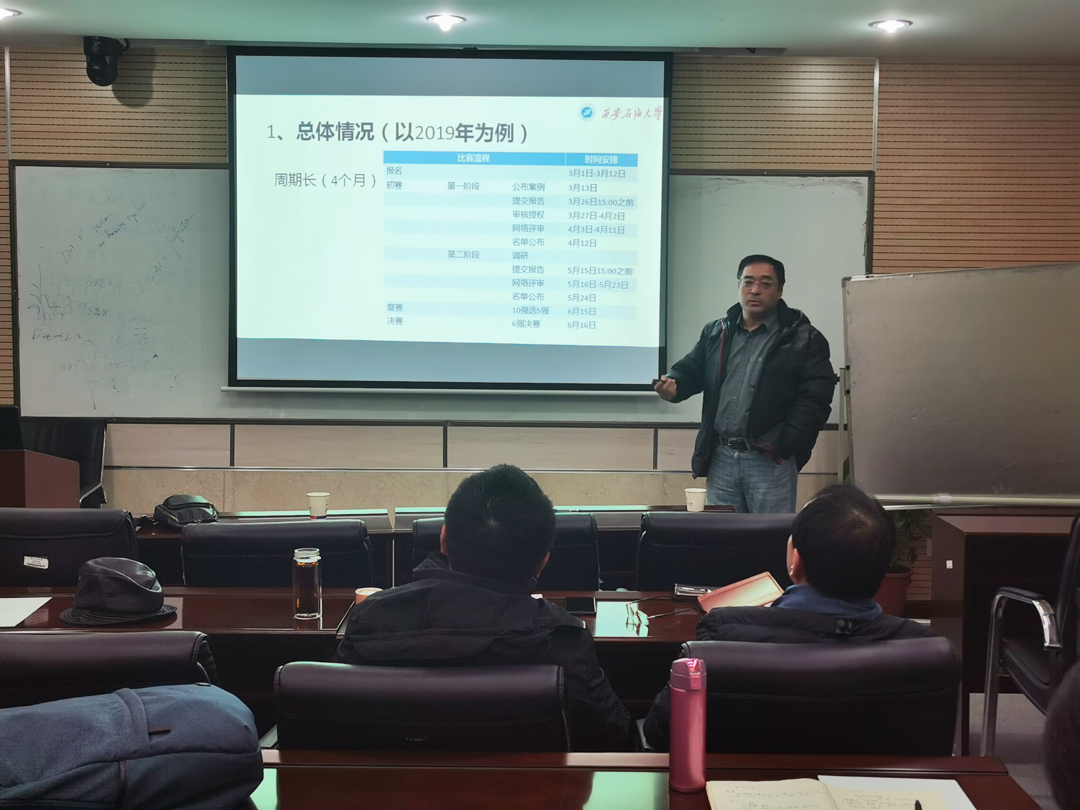 金帆主任首先对张庚淼老师和刘毅老师的到来表示真诚的感谢和热烈的欢迎,然后对参会人员介绍了案例大赛举办的重要性、学院对案例大赛的重视程度、我校校园案例大赛和全国案例大赛组织的基本情况,并对参加培训的指导教师提出了一些具体的工作要求。