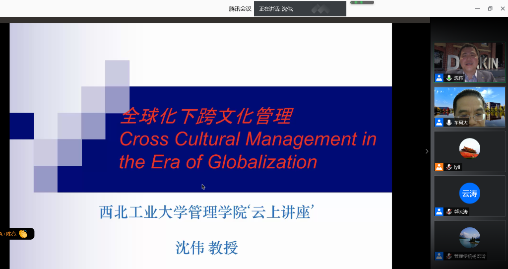 9月16日晚上,我院特邀请澳大利亚墨尔本迪肯大学协理副校长、BEAT365唯一官网客座教授沈伟老师带来“云上讲座”--《全球化下的跨文化管理》。讲座通过腾讯会议平台直播,由车阿大院长主持,2020级专业学位研究生共计325人线上聆听了讲座。