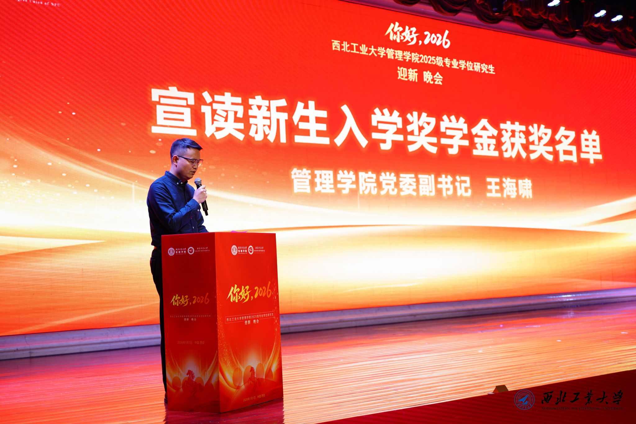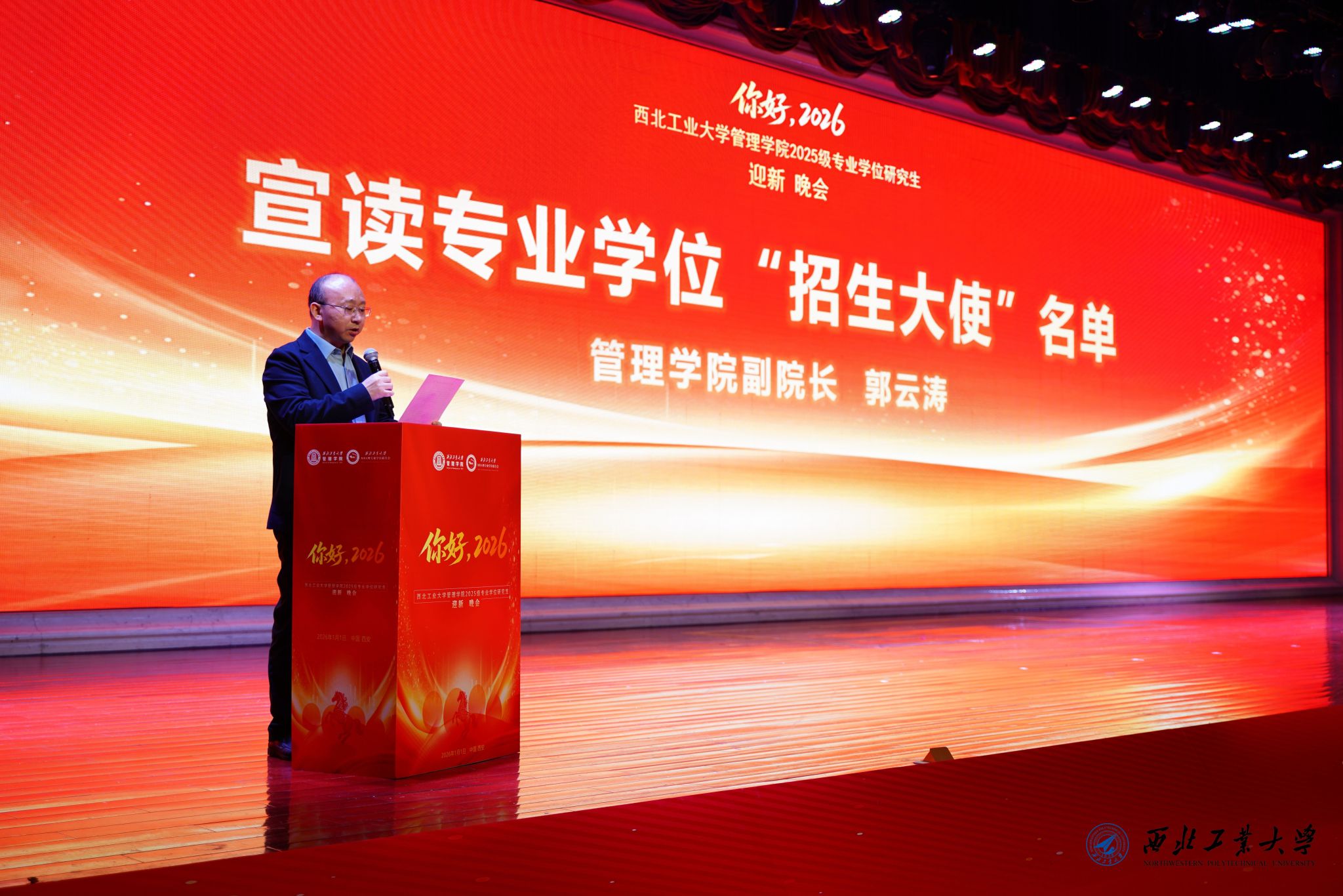 2026年1月1日晚,BEAT365唯一官网2025级专业学位研究生迎新晚会在金色大厅隆重举行。学院领导、工作人员、部分校友和2025级全体专业学位研究生新生参加了此次晚会。