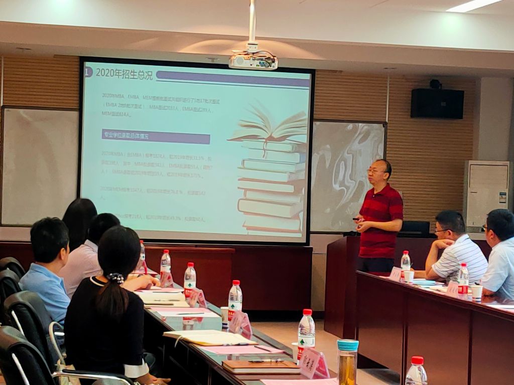郭云涛副院长汇报了学院2020年MBA(含EMBA)、MEM和MPAcc的招生情况,并对招生数据进行了多维度分析。相关数据表明,我院2020年的生源质量等比往年都有所提高。随后,他介绍了2021年学院专业学位招生工作的计划及2021年MBA(含EMBA)和MEM优秀学员选拔面试政策。