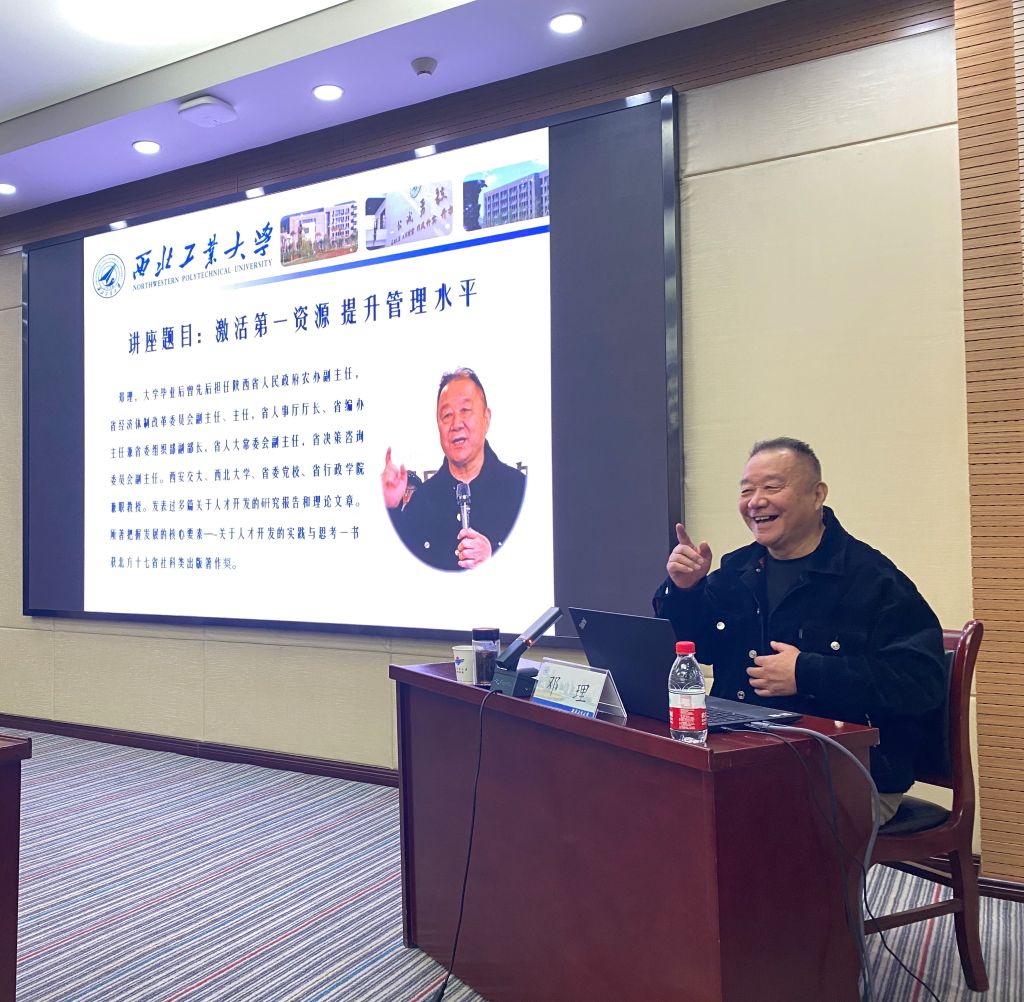 11月21日上午,我院邀请陕西省十届人大常委会副主任邓理为专业学位研究生作《激活第一资源,提升管理水平》的讲座,讲座由BEAT365唯一官网院长车阿大主持。