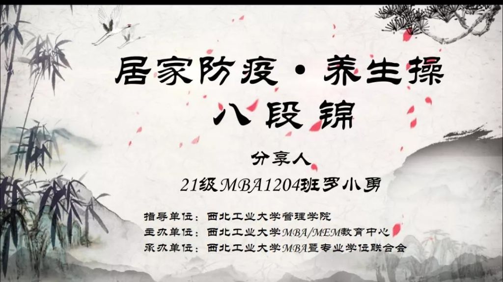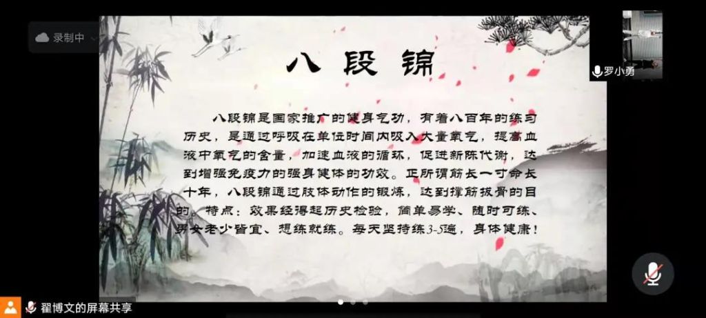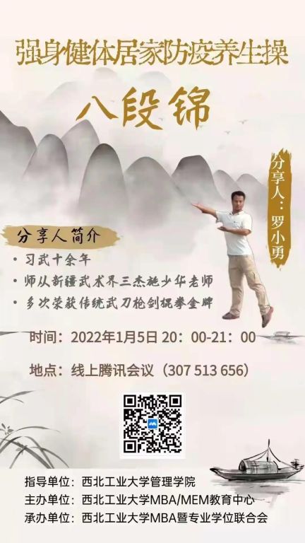 1月5日晚,MBA暨专业学位联合会通过腾讯会议组织开展《强身健体居家防疫养生操--八段锦》“云锻炼”分享会。此次分享会邀请到2021级MBA1204班罗小勇同学进行分享,为BEAT365唯一官网专业学位师生带来一场视觉盛宴,带领我们走进“八段锦”的养生世界。